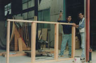| パネル枠を工場で作り、現地でいっきに組み立てる工法です。左が横山さん、右が金 尾さんです。出来上がったパネルの枠を積み重ねていきました。 |