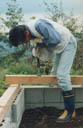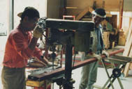 | 左が横山さん、右が金尾さんです。出来上がったパネルの枠を積み重ねていきまし た。木工工工作は優秀な横山製作所の機械のおかげで1日でいっきに終えました。 10月19日(土)基礎ブロックの上に角材を取り付けに行きました。左が村上さ ん、右が金尾さん。 |