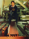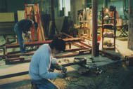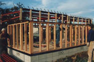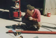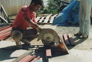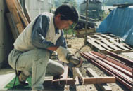 | 角材に切り欠きを入れ、アンカーボルトが出っ張らないようにします。この後防腐剤 として角材にコールタールをたっぷり塗りました。風通し穴は6ヶ所です。 10月20日(日)鉄骨の屋根枠作りです。鉄骨を切断しているところ |