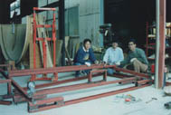 | 横山さんと金尾さんが鉄骨に穴を空けているところ。 10月27日(日)この日も鉄骨の屋根枠作りの続きです。東さん(左)と的場さん (中央)が加わりました。屋根枠を仮組立したところ。 |