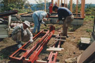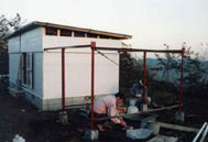 11月3日(日)会員を総動員していよいよ現地組立が始まりました。錆止めを塗る高橋さん(左端)。横山さんは高熱を押して指揮をとります。右の横山さんのトラックで建材を運びました。 |