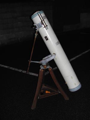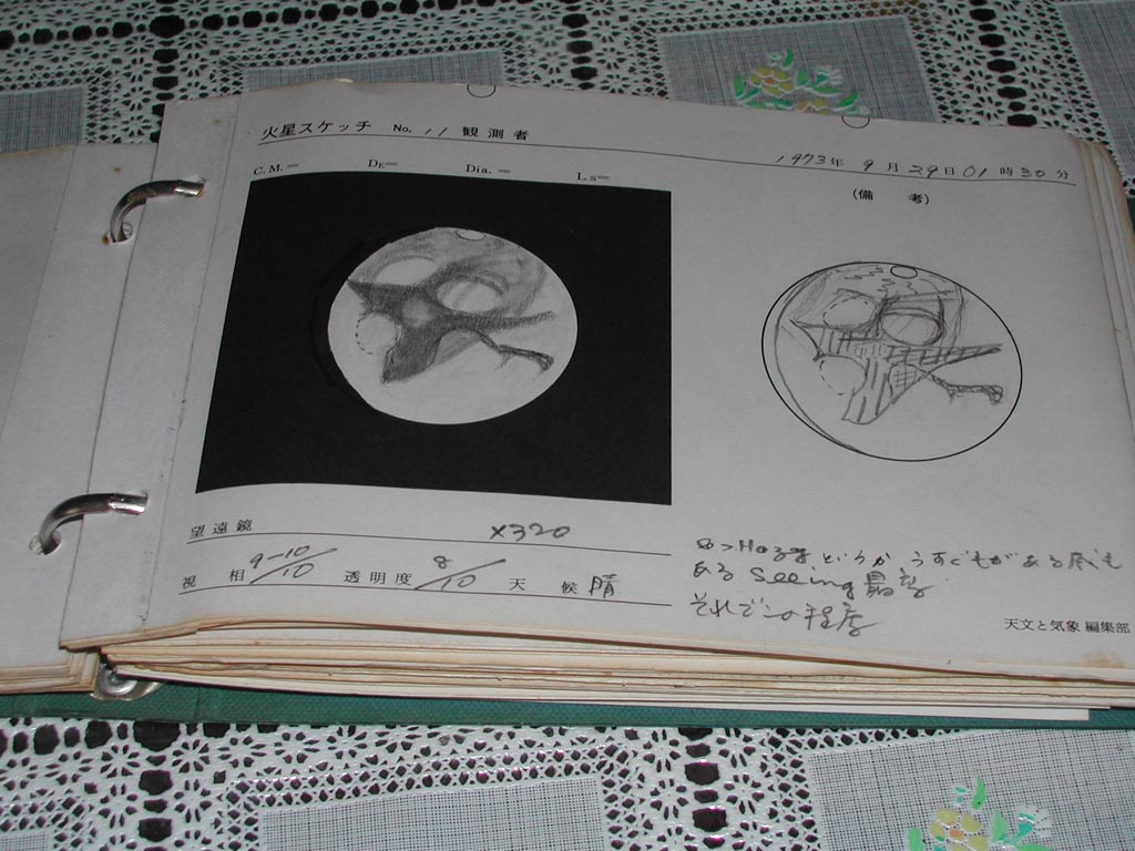 西村の15cm反射経緯台を譲り受けました。 美しいカーブの木製三脚です。 反射鏡は星野次郎氏によるもので、 320倍にしても像は非常にシャープです。 持ち主だった高杉さんが30年前に描かれた 火星のスケッチをご覧ください。 今回の大接近に合わせて再メッキされたのですが、 その際ミラーを測定した人が パーフェクトミラーとの折り紙をつけたそうです
