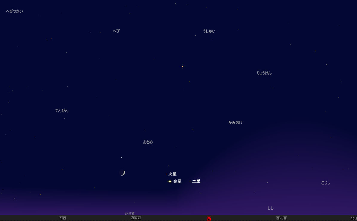 @17時頃は月齢4.3の月が西の空にあり、そのすぐそばに火星・金星・土星が輝いている。
