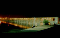 「こりゃアフリカまで行かにゃいけんわ 出宮先生は今回の日食のために 170〜500ミリのズームレンズとタカハシの新発売の軽量赤道儀を購入し、 日本でテスト撮影もしてシャッター振れのないのを確認し、完璧な準備をしておられた。ところが、 なぜか現地でカメラにエラー表示が出た。それを解消するためにあちこち触っているうちに、 いつの間にかオートフォーカスモードになってしまっていたらしい。ピントリングはガムテープで固定していて、 黒い太陽にピントが合わせられないカメラがシャッターレリーズを拒絶した。全く予想外の事態である。 写真は一枚も撮れなかった。出宮先生は再来年アフリカのザンビアまで撮り直しに行く決意である。夜ホテルの前の川にかかる 橋を中谷さん,芦崎さんと見に行った。川に沿って芝生公園になっており、 夜の10時頃だというのに沢山の家族連れが芝生の上に絨毯を敷き、 ガスボンベ付きコンロを使ってピクニックをしている。橋は2階建てで1階には お店が並び,2階が歩行者専用となっている.長さは300メートルくらい.車は通 れない.橋の下の浅瀬になった石畳を靴を脱いでたくさんの人が歩いている.みんな とても楽しそうだ.歩いていると次々に「ジャポネ?」と聞かれる.「イエス」と言うと握手を求められる. 写真に一緒に収まってくれと頼まれる. 若い女の子の集団がやってきて「イラン人に対する外国人の意識調査をレポートしたいから」といって 「イランの女性をどう思うか」「私たちの服装はどうか」などと英語で質問する。