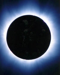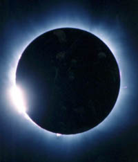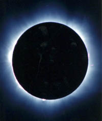 今回のコロナはメキシコ, インド日食にも増して美しかった.太陽の回りのいたるところにプロミネンスがあり, コロナも典型的な極大型でダリアのような形だった(コスモスのようだったと千葉の 小川さんの手紙にあった.コロナの透明感は秋のひざしに透けて見えるコスモスの花びら. プロミネンスはルビーに例えてあった.)クラブの15×45, スタビライザー付きの双眼鏡で10数秒間見ることができた。 (インドの時は皆既はわずか40秒.持って行った望遠鏡も双眼鏡も覗かないうちに終わってしまった.) 下の方に飛びだしているプロミネンスが見えた. 真っ赤ではなくピンク色だなと思った。コロナの流線については意識的観察はできなかった 。 裸眼では、最近の画像処理したどんな立派な写真よりはるかにくっきり見え、透明感があった。 こんな写真は誰にも撮れないからはるばる見に来たんだ.隣で双眼鏡を覗いた中谷さんが 「オー、オー!すごくきれい。」と叫んでいる。とうとう第3接触のダイヤモンドリングになり皆既は終わった。