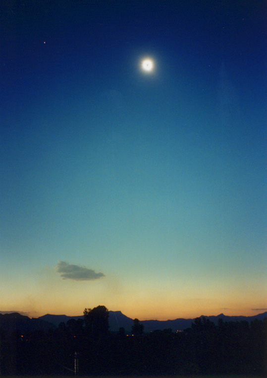 題名: 皆既日食中の景色(地平線が明るく、天空が濃紺で金星が見えています)