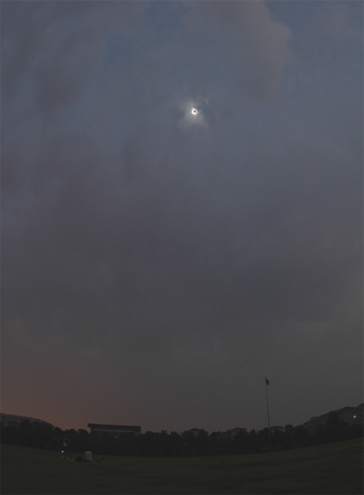 つる仙人です。 弾丸ツアーもまずは成功裏に終わり、今年前半の大イベント終了ですね。 それにしても奇跡的な晴れ間でした。 画像にもありますように、雲だらけで、雲の切れ間を縫った観望・撮影となりました。 データ: 2009年7月22日 9時37分54秒より2秒露光(中国時間) フィッシュアイニッコール16mmF2.8をF5.6に絞る ニコンD70 中華人民共和国浙江省安吉 宇翔外語学院運動場にて撮影