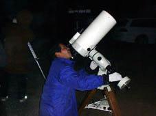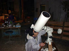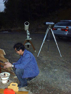 愛機(?)高橋フローライトを覗く後藤さんと、架台に着いている自動導入装置(ビクセン