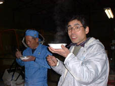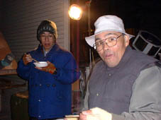 鍋を楽しむ横山さんと近所の鉄工所のおじさん。