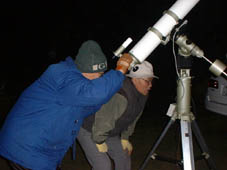 ミューロンを覗く金尾さんと宮内の双眼鏡を覗く高橋さん。 |