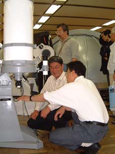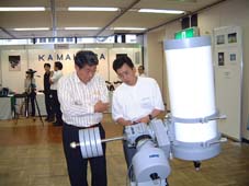 宇治天文精機さんの この30センチカセグレンの重心に注目。鏡筒の根本に近い部分にあります。 その分、安定度や取り回しがたいへん楽になりますし、屈折を同架しても 接眼部が同じところにきます。また、このおかげで、30センチの鏡筒は 少しコツがいりますがたった一人で取り付け取り外しが容易にできたりします。さらに、CCDやカメラを接眼部に取り付けても、重心位置が極端に移動しないので、楽々セッティンクが可能です。これはうれしいです。興味もあるので ずいぶん長い間、ここのブースにいました。これで価格が 確か、218万円だと、お聞きしたような・・・(昼間っからビール飲むなって!) もちろん、宇治天文精機さんの許可を得てグラグラ揺すってみました。全く問題なし。 このシュミカセの特徴は補正レンズなどもいっさい使用せず、鏡面を反射した光は副鏡で反射し接眼部へストレートで導かれます。 もう一つ 特徴ですが、架台部分が分割出来ます。台座+赤道儀+鏡筒バンド+重り ですから それほど無理をしなくても 移動据え付け作業がたった一人で可能とのことで 移動観測も、十分可能になります。 |