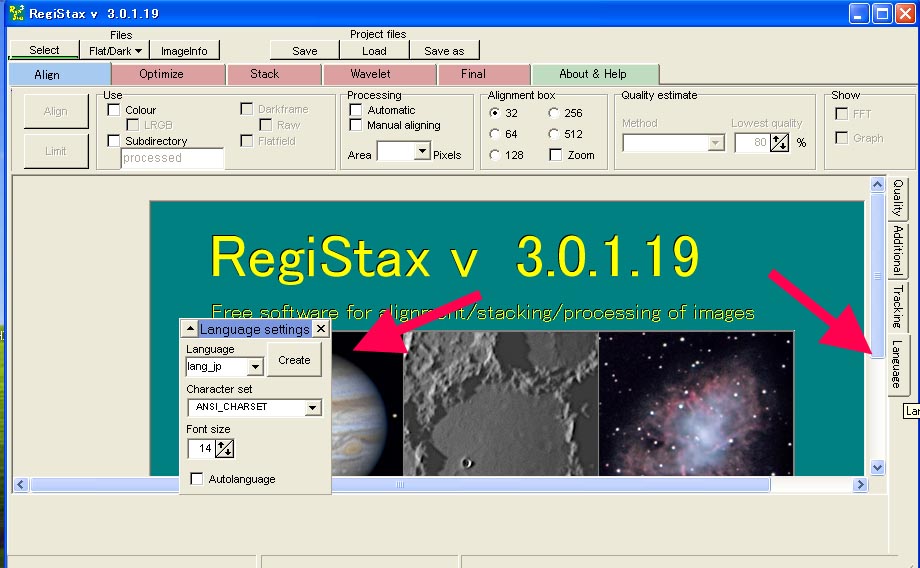 それが済んだら Registaxを立ち上げて右下のLanguegeを押してLanguage settingのところをLang_jpに変更をします。