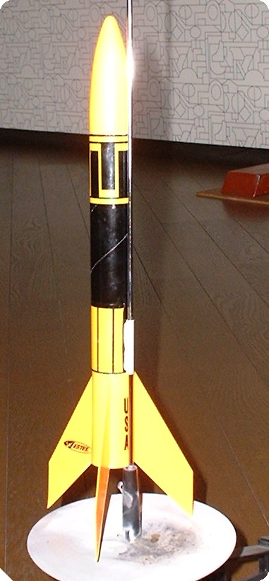 | 先端の部分が外れてパラシュートが出て来るので、 エンジン以外は再利用出来ます。 説明によると最大高度は300メートル以上になるそうですが、 そこまで打ち上げると、航空法?の高さ制限に違反することになり、また視界から消え、ロケットの回収地点が 1kmも先になることがあるので、回収不可能になるそうです。 現在手元にある最も小型のエンジンで、見た目で50メートルくらい打ち上がるように感じますが、定かではありません。まさにミサイルのように飛んでいきます。 |