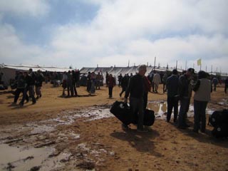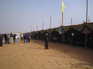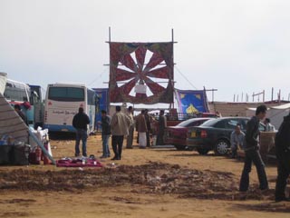 ![]() キャンプ場の食堂テントで朝食を済ませた人達が機材の設営にとりかかりはじめました。 |