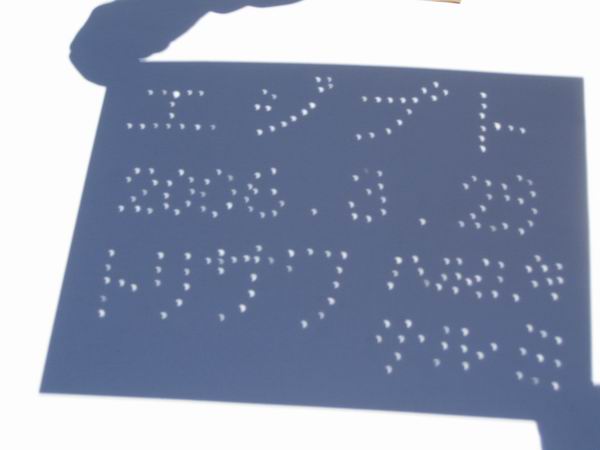 厚紙に穴を開けると欠けた太陽の絵文字ができあがります。 関東地区の女性の作品です。 |