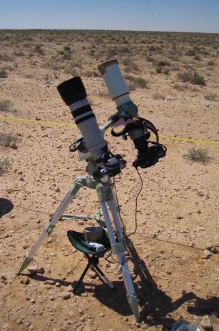 ![]() マイ望遠鏡セットです。 右がペンタックス75SDHF+EOD20D 左が100-400mmISレンズ+EOS55 因みに左の組合せで撮った写真はゴーストだらけで悲惨なものでした(涙)。 |