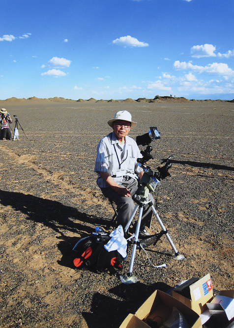 2008年7月30日 朝8時関空集合との事で、前日から全日空臨空タウンホテルで一泊。 10時中国東方航空機で上海国際空港へ行き、ウルムチへ行く為に国内機用空港へ移動し、夕刻出発。夜半23時頃ウルムチのホテルへ。 7月31日 早朝巴里坤に向ってバスで出発。約600K余りを奇台を経由して数箇所観光しながら夜巴里坤ホテル着。 8月1日 早朝モーニングコールで起床。朝食後観測地の下湖村へ。150K4時間で到着予定で出発したが、テロ頻発の為に途中で度々公安の検問 荷物の検査があり、加えて150Kの半分近くは未舗装でもうもうたる土煙、加えて軍用道路の種々の規制もあり、到着は可成り遅れた模様でした。現地に着いてバスから降りて見ると、確かに広々として自由に場所が選べましたが、その暑いこと。カーッと日射が強く、機材を拡げる意欲をそがれました。カメラも架台も触れられない位に熱くなり、一瞬混乱しましたが、気を取り直して何とかビデオを1台だけ設置しましたが、リモートコードを取り付ける元気も失せてしまいました。その為に第1接触から遅れ、太陽像も録画ボタンの度に揺れました。数百米程のところに藤田さんや玉井さんがいるユーラシヤツァーが居ましたが、テント泊がうらやましく感じました。日食の方は順調に見ましたが、2、30秒前から突然雲の固まりが近づき、第2接触10秒前位に太陽を覆い隠しました。私の前々回、オーストラリアと全く同じでした。もう諦めるしかない。雲の切れ目から時々皆既の太陽がのぞきましたが、ビデオの録画ボタンを押すのを忘れていました。日除けの傘を持っていたのですが余り効果がありませんでした。何しろ暑かったです。日本旅行ツァーの南支店長が心配して、出宮さん大丈夫ですかと声をかけてくれる程、憔悴していたのかも知れません。後は一路巴里坤へ帰るだけ。やっと機材をスーツケースに押し込んでバスに逃げ込みました。そして深夜巴里坤ホテルへ。 |