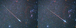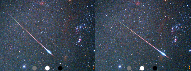 立体視画像を作ってみました。画像をクリックして写真を拡大し 目を「寄り目」にすると雄大なオリオン座をバックに流星がステレオで見ることが出来ます。うまく見えたら教えてくださいね。![]() |