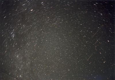 | 2001年11月19日 午前1時57分 火球と、超珍しい静止流星その流星痕画像 流星痕は5分以上続いて見えました 右は、10秒前の火球(下)と、静止流星最大光度静止画 1,720キロバイトあります |