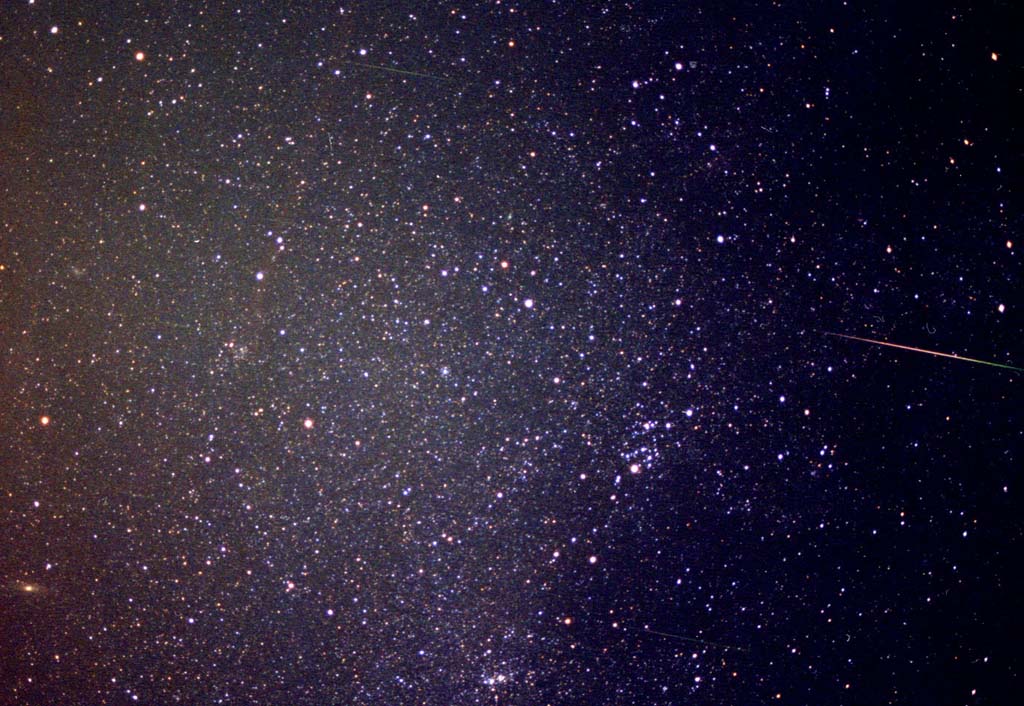 | (1)左下にM31アンドロメダ銀河、左端真ん中にM31、中央下端に二重星団。 中央やや上にリニヤー彗星も写っているのですが、ちょっとわかりにくいと思います。 28ミリF2.8開放で、3時34分から39分まで5分間露出。 4枚ともフジ・スーペリア800フィルム使用 画面をクリックすると大きくなります |