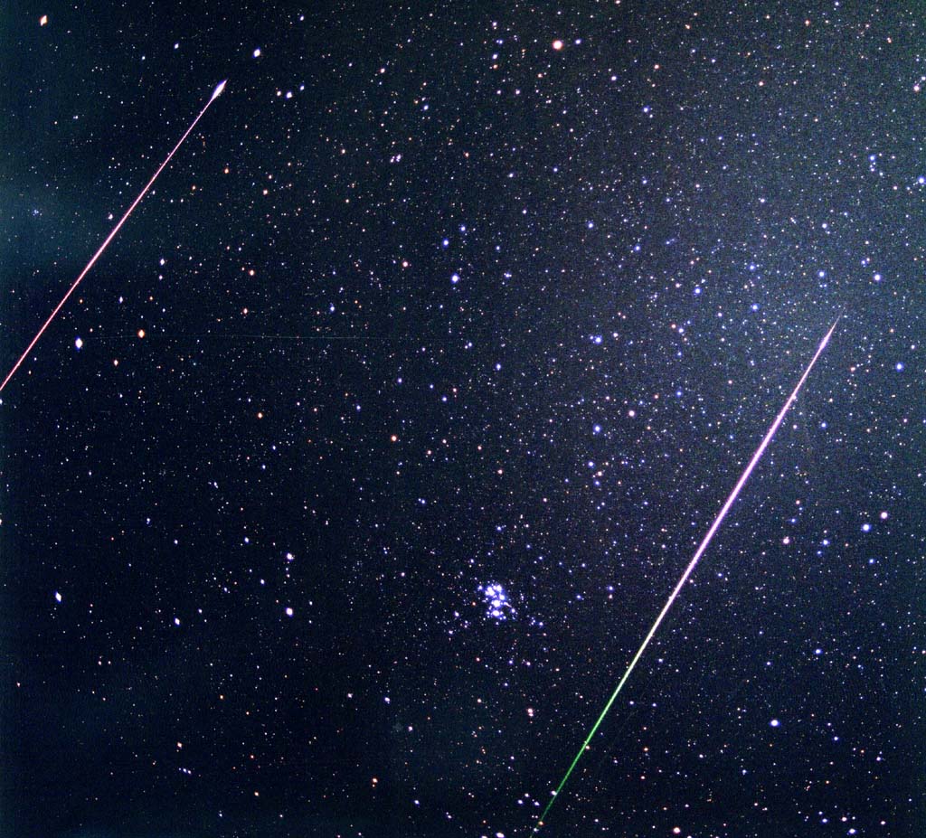 | (2)すばると流星の競演です。 28ミリF2.8で2時9分から14分まで5分間露出 画面をクリックすると大きくなります |