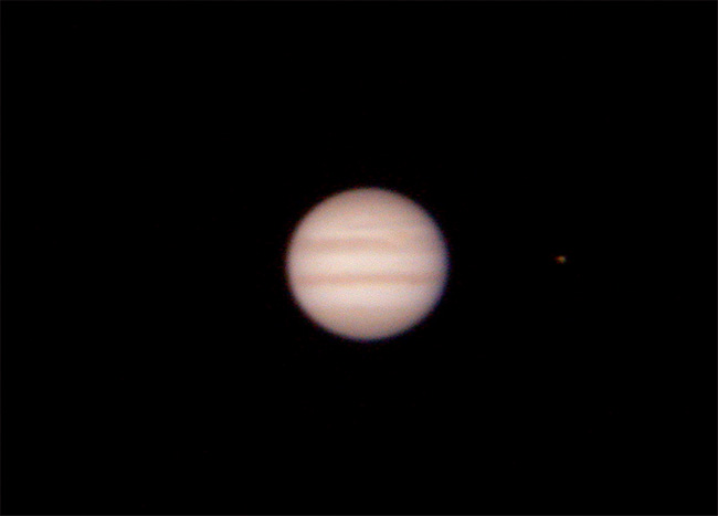 まず、光軸を固定するのが困難です。コリメートではピントが出ないのかも。 という私の苦労を尻目に、孝行が木星の写真を撮りました。 ニコンCoolPix995によるコリメート撮影の一発もので、皆さんの画像から すると見劣りしますが、まずまず撮れていると思います。 撮影日:2003年3月22日 セレストロンC8 ビクセンLV10mm