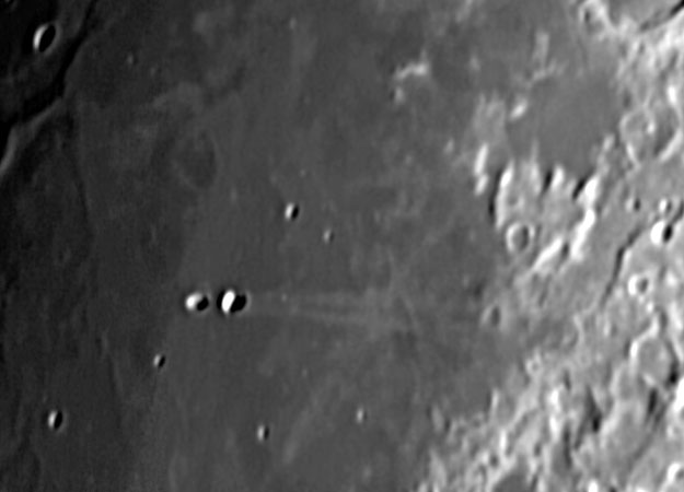 Messier メシエ(二つ並んだクレーターのうち、左側の楕円形の方。月面に斜めに衝突した例)![]() |