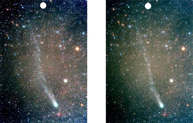 どうやってみるのか?? 写真の真ん中に頭を持って行き、指を20cmくらいのところに立てて、指先に目のピントを合わせて そのまま画面の白い丸に意識を集中すると、星空を背景に「池谷・張彗星」が浮かび上がります ※画像は彗星のテール(尾)を強調してあります