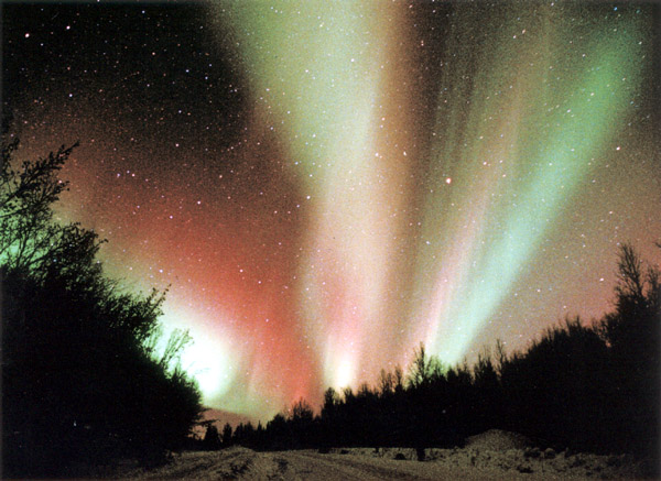 見事に晴れた空をアーチ状のオーロラが2分したように出現。