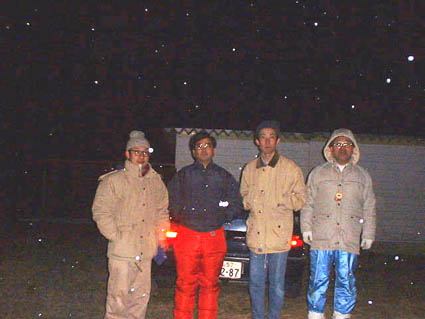 雪の中 麻田記念天体観測所にて記念撮影 帰り支度を始めた午前5時半ころ突然曇り、