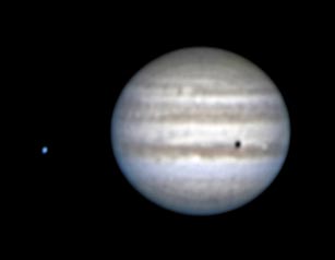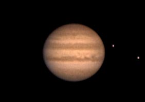 | 昨夜はここ数日では一番シーングが良く土星の模様と衛星の影が くっきり見えました。 2004年2月16日24:20 口径15cmマクストフ、ペンタックスXP24oで拡大 ToUcam Pro 1/33秒で1200コマ撮像、 Registax処理。 衛星の影はすぐ右に白丸として見えるイオのもので、 本体左側の衛星はエウロパのようです。