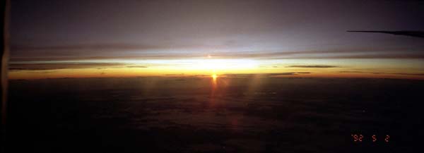 | 星を見ながら太平洋をジェット機で南下し、オーストラリア上空にさしかかった時夜が明けました。 |