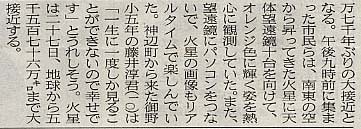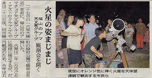 福山の緑町公園で行われた、火星観望会のようすが掲載されました。 望遠鏡は、口径25センチ、イギリス・オライオン社の反射望遠鏡。後ろに立っているのが所有者の熊原さんです。 |