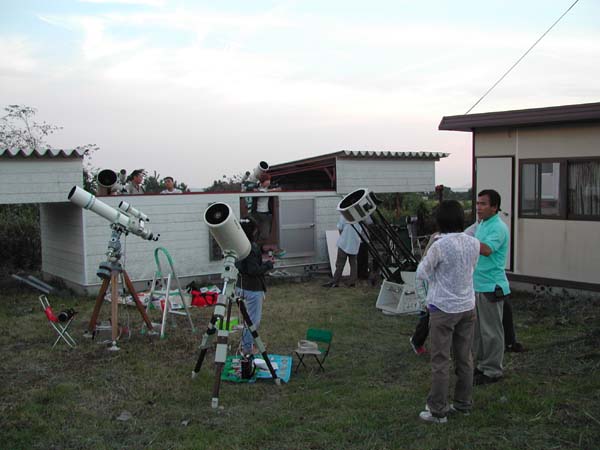 | 福山市緑町公園での火星観望会には11台もの望遠鏡がそろいましたが、なにしろものすごい人出で人波に隠れて、 どこに望遠鏡があるかわからないくらいでした。少なくとも千人は来たのではないでしょうか。 ずらりと並んだ望遠鏡は