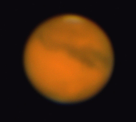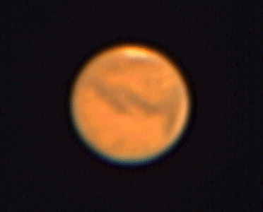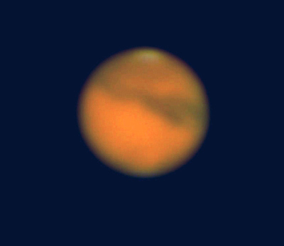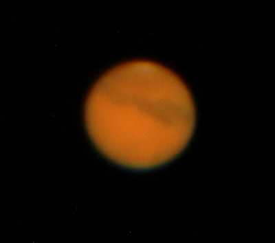 撮影日時:2003/08/29 01:39 中谷浩吉 昨夜の火星です。 望遠鏡 :タカハシ ミューロン250 + Pentax XP 24mm + 接写リング 石井コメント:あのポヨ〜ン♪ポヨ〜ン♪の火星が