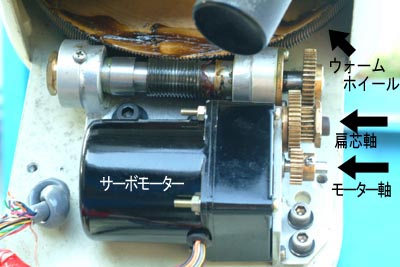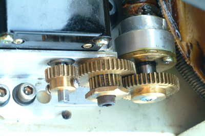 早速、カバーを外して見ると 写真 (1、2、3)の状態が見られました。 ペンライトを口にくわえて薄暗い照明の中、分解に取りかかる。 (1)モーター固定ネジを外してモータードライブ全体を外す。 (3)モーター部を歯車B方向に寄せて適当な歯車間を調整する。 (4)そしてB歯車を六角レンチを緩めて外してガソリンで洗い注油して元に戻す。 |