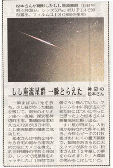 11月18日午後11時,仕事を終え帰宅。途中車から夜空を見上げるも一向に流れ星が見える気配がない。 昨晩の極大日がべた曇りとなり、今年のしし座流星群はあえなく終了したものとほぼあきらめていた。未練がましく午前0時、午前1時と1時間おきに自宅の窓から顔を出し夜空を見上げるも流星の姿は見えず、今日の仕事の後片付けをしてもう寝ることにした。最後にもう1度と床に就く前の午前2時に見上げたところ2,3分の間に2個の流星を確認。ここから事態は急変。もしかしてこれから明け方にかけて増えるのかもしれないと、バラバラにしてあった三脚や赤道儀を2階から担ぎ出し準備に取り掛かった。何分これまで写真を撮影した経験がほとんど無い素人なもので、あたふたしながらセッティングをし、午前3時前から撮影開始。 福山の街明かりが有るため1コマ90秒を目安に、かに座から牡牛座、オリオン座、双子座と数コマごとに位置を変えていくもなかなか枠の中には入りません。 それでも午前3時から午前4時の間は比較的多く(1時間に30個程度)は流れていたようです。特に北側よりも南側の低空で多くの流れ星が確認できました。途中すばる付近を流れた1等星くらいものは撮れたと思ったのですが、まったく写っていませんでした。 そうこうするうち午前4時を回り、静寂を切り裂く新聞配達や牛乳屋さんのバイク音があちらこちらで聞かれるようになり、町が眠りから覚め空が少しづつ明るさを取り戻し出し始めてしまいました。更に悪いことに流れ星がほとんど見られなくなってしまい、撮影もそろそろ限界と感じたので、フィルムの残り枚数を使い切って明日の仕事に備えて早く寝ようとしていたところ、 36枚目中の35枚目で この日見た中では最大の流星(流星痕も確認)が午前4時29分頃流れました。 昨年の11月18日の午前1時47分に流れたものも見ていましたがそれよりは暗かったように思います。 フレームの一部には入っていると思いましたが全体が入っているかどうかは半信半疑で翌朝すぐに現像してもらいきれいに納まっていることを確認し、 やっと喜びに浸ることができました。 その後、児玉先生に写真を見ていただいて、色々と助言をいただき、新聞にも載せることができ、より一層の感激を覚えました。素人の自分が、十分な準備の無いままこれだけの写真を撮ることができたのはラッキーとしか言いようが有りません。 今回は粘り勝ちというより運が良かっただけだと思います。また運が良ければ挑戦してみたいと思います。 |