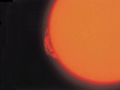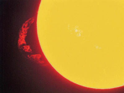 アストロクラブふくやまの1月の例会に会員の出宮美克さんが持ち込んだコロナド社のソーラーフィルターで巨大なプロミネンスが見られました。例会参加者一同はテレビのモニターで見たり、直接眼視し、非常に感動しました。その映像は出宮さんがニコンのデジタルカメラ・クールピックス990で撮影されました。高さは太陽の直径の1/6、幅は2/5もある歴史的なものです。