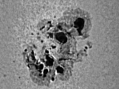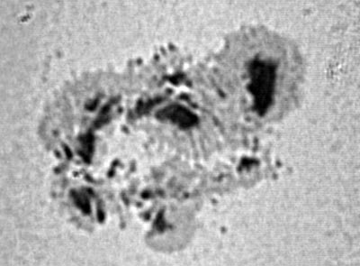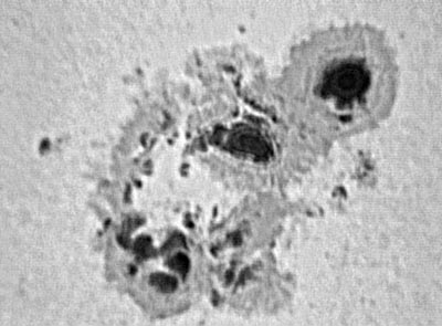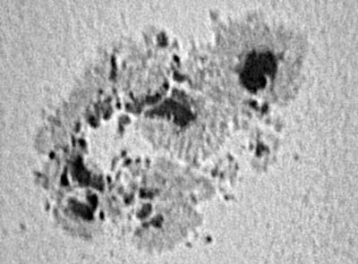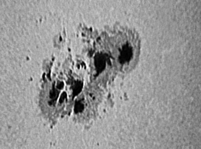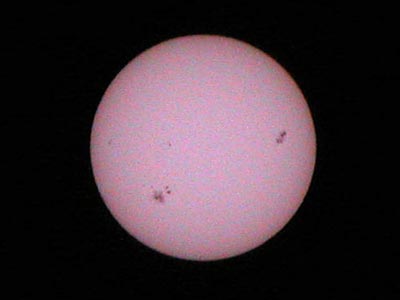 | 肉眼黒点をToUcam Proで撮影してみました。児玉 2003年10月22日〜27日、瀬戸観測所にて ビクセン口径102mmフローライト屈折望遠鏡に アストロソーラーフィルターを使用 2倍テレプラスを2個使用、合成f=3600mm ToUcam Proで撮像、Registax で画像処理 |