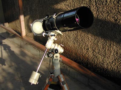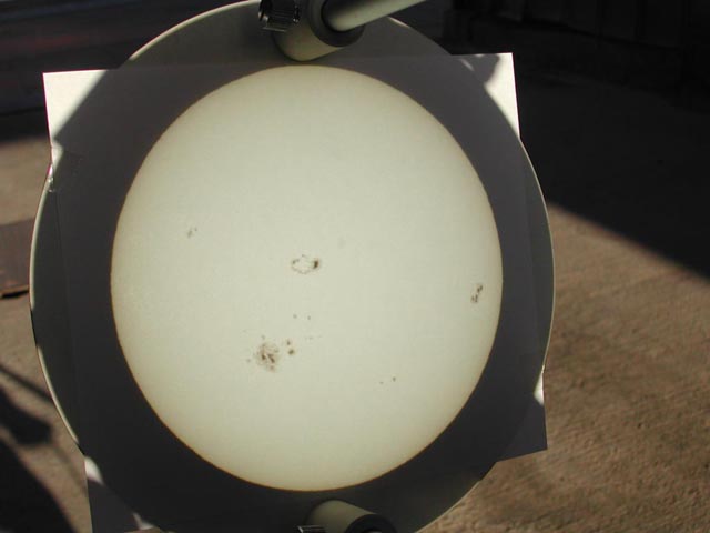 塾の横に望遠鏡を置いて、西に傾いた太陽を投影してみました。 太陽面全体を見ると、改めてその巨大さがわかります。 明日は向かいの小学校の生徒に見せてやりたいと思っています。 投影像をデジカメで撮って、左右を反転して直接太陽を見た向きにしてみました。 |