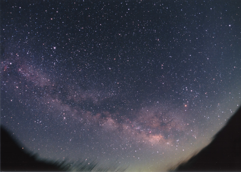 昇る夏の天の川 藤井孝行さん 撮影日:5/3 レンズ:ニコン フィッシュアイニッコール16mm 絞り:F2.8⇒F4 露出時間1:22〜20分 フィルム:フジクロームプロビア400F
