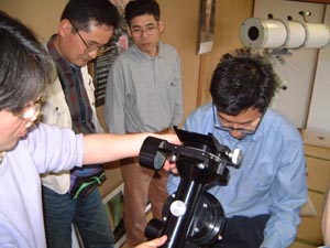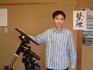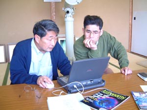 横山さんのパソコンに変なファイルが入っているのを検証中の石井。下は横山さんから譲り受けた、タカハシ製MT-200とNJP赤道儀![]() |