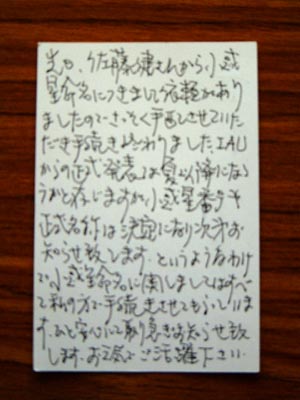 ![]() 小惑星に自分の名前が付く、 佐藤会長。は藤井さんからの手紙を皆さんにお披露目 小惑星に名前を付けなくてはならないと、まるで新米の父親がこどもに名前を付けるときのように、はしゃいでおられました。命名は syozo