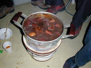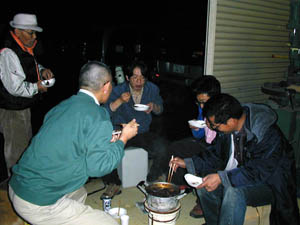 池田さんが尾道の鍋研究会まで行って分 けてもらってきた煮汁をもとに、 石井さんのレシピに従って鍋奉行金尾さん が中心になって作成したみそおでん! おなかいっぱい食べました。 |