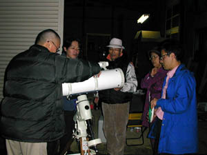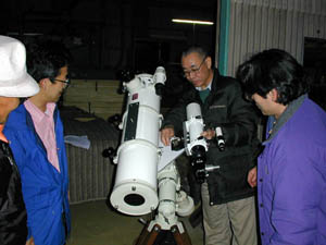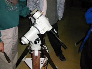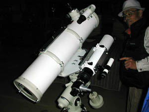 熊原さんが購入検討中のEM200赤道儀を みんなでチェックしました。 判定はマル。 20万円で熊原さんが購入することになりました。 |