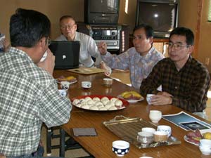 金尾さん特製の、芋まんじゅうは大好評。 「このまんじゅうで店でも出せるよ」という ご批判に、皆食べ過ぎてしまう。 |
