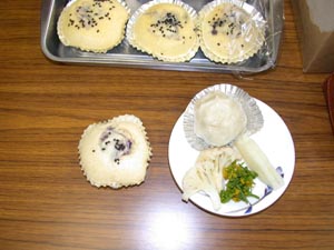 上に3コ見えるのが金尾さんお手製の蒸饅頭。中には自家栽培の紫芋が入っています。お皿の上にあるのが高橋夫妻の蒸饅頭。自家栽培の山芋と池田さんのお米、近所でもらったあんこが入っています。会場で蒸したてのほかほかです。酢ずけにしたブロッコリーとオオタムポエムの青いつぼみを塩湯がきしたものと、たくあんおつまみが添えてあります。