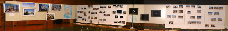 | 体育館の中では、中谷さんが昨年イラン日食旅行で撮影した写真が数十枚キャビネサイズに引き伸ばされて展示してありました。出宮先生のA3サイズのイラン風景のプリントアウトは写真かプリンターの打ち出しか全く区別のできない鮮やかな出来でした。中学校の教科書に載ることになった小川さんのプロミネンスの写真もありました。画像をクリックすると拡大します |