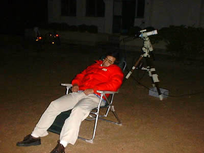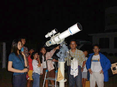 小学校屋上には26センチ反射赤道儀があります。 低空にもかかわらず、土星の環が結構綺麗に見え、特に初めて見た人は感動していました。高度が上がるにつれ、カッシニの空隙が全周シャープに見え始めました。特に金尾さんの屈折はコントラストが高く、3.8ミリアイピースでも実に切れ味の良い安定した像が見えました。4時前に薄明が始まり星が少しずつ消えていきました。し かし空には木星しか見えなくなった午前6時頃まで、みんな何度も何度も土星や木星を見て名残を惜しみました |