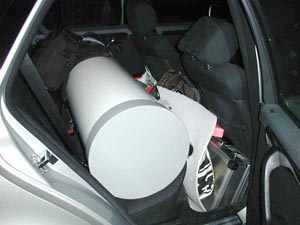 | 遠藤さんのベンツワゴン後部座席に鎮座する35p反射鏡筒。焦点距離1500ミ リ。車に合わせて特注したそうです。 |